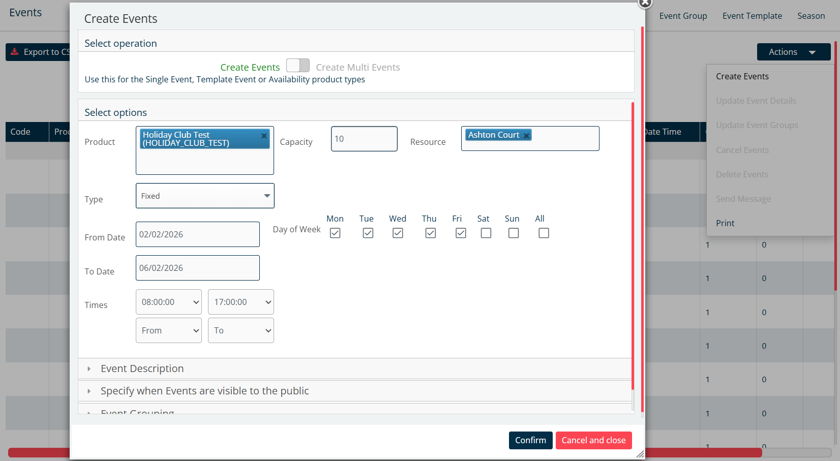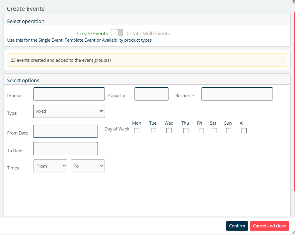 3. Click on Confirm to create the event/s. Once the event/s are created, you will see 'xx events created and added to the event group(s)' as below.