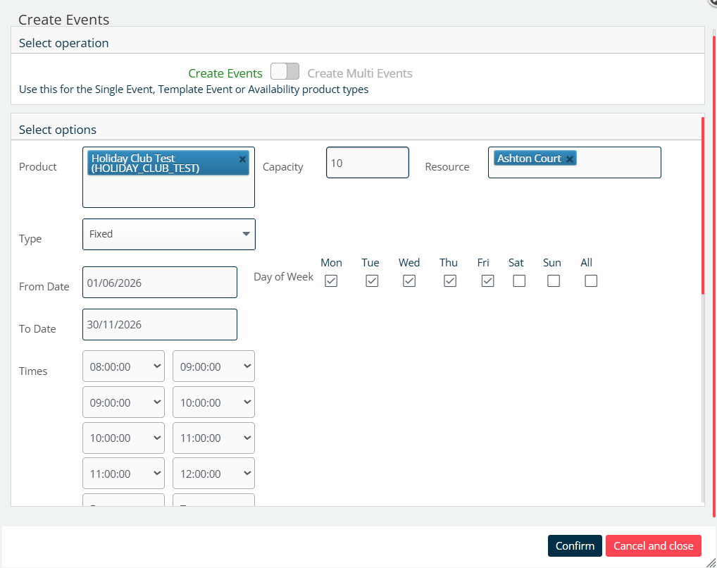 From this display you have the option to create one single Ad-Hoc OR Regularly recurring events at set times and dates. Note, you can add multiple days, and multiple times throughout that day, as well as multiple products in one go!