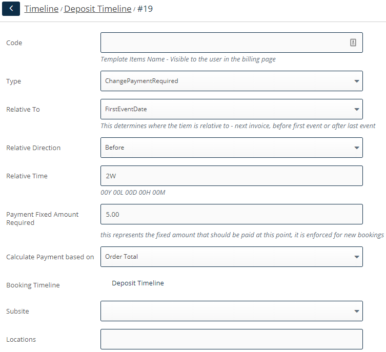 Below is an example of a Timeline Event that would allow the customer to pay a £5 deposit when booking onto an event over 2 weeks before the event date: